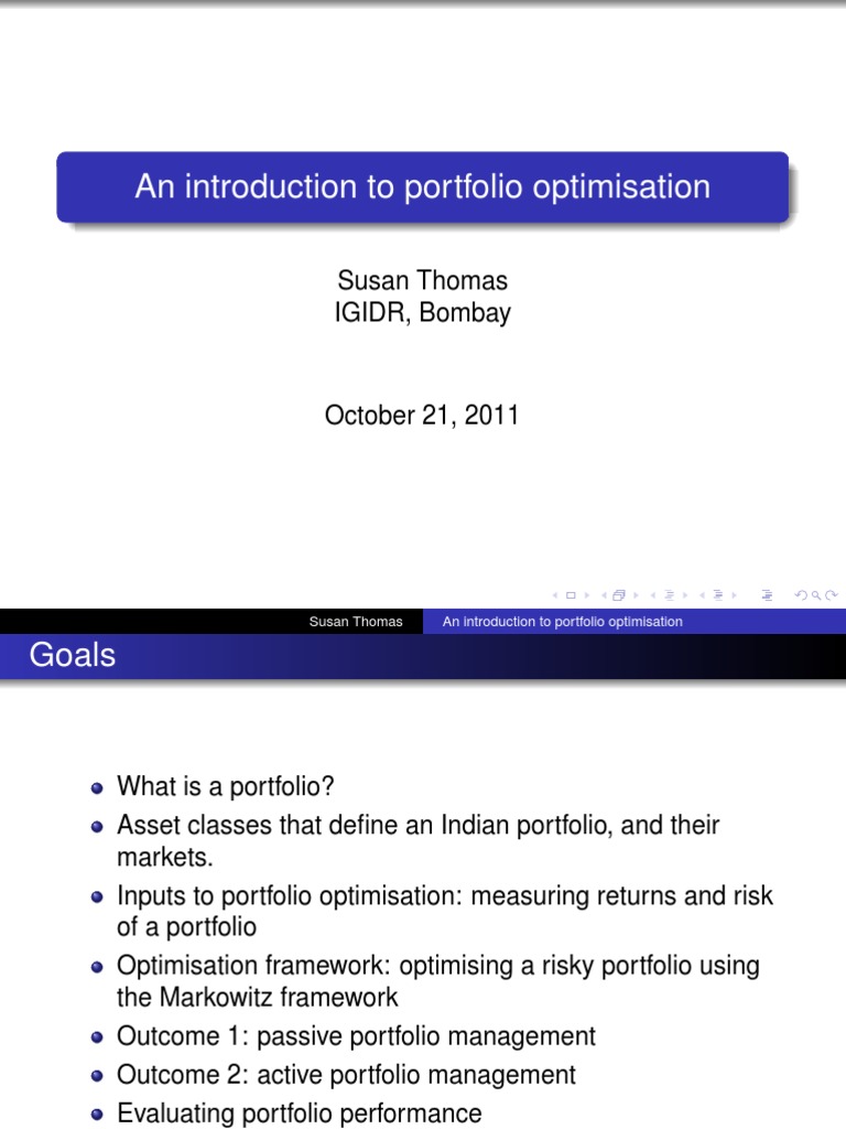 What is a portfolio? Asset classes that dene an Indian portfolio, and their markets. Inputs to portfolio optimisation: measuring returns and risk of a portfolio Optimisation framework: optimising a risky portfolio using the Markowitz framework Outcome 1: passive portfolio management Outcome 2: active portfolio management Evaluating portfolio performance