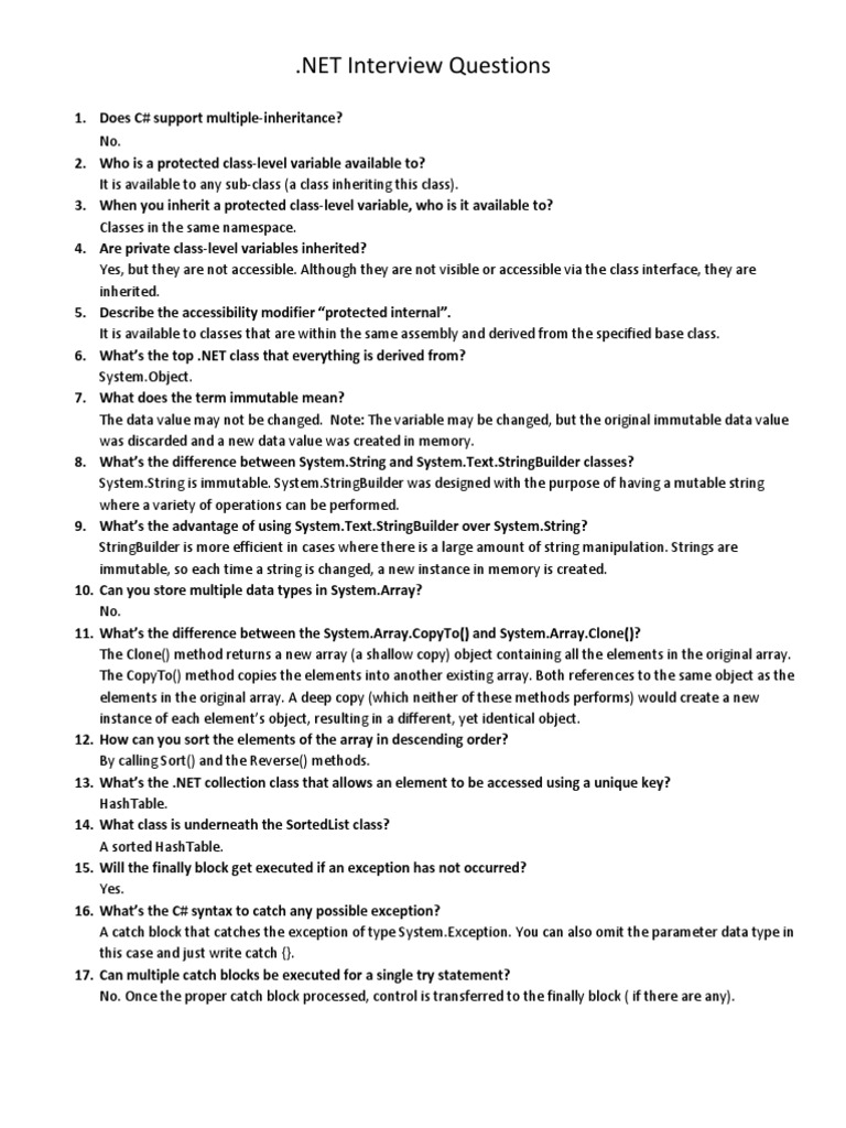 1. Does C# support multiple-inheritance? No. 2. Who is a protected class-level variable available to? It is available to any sub-class (a class inheriting this class). 3. When you inherit a protected class-level variable, who is it available to? Classes in the same namespace. 4. Are private class-level variables inherited? Yes, but they are not accessible. Although they are not visible or accessible via the class interface, they are inherited. 5. Describe the accessibility modifier protected internal. It is available to classes that are within the same assembly and derived from the specified base class. 6. Whats the top .NET class that everything is derived from? System.Object. 7. What does the term immutable mean? The data value may not be changed. Note: The variable may be changed, but the original immutable data value was discarded and a new data value was created in memory. 8. Whats the difference between System.String and System.Text.StringBuilder classes? System.String is immutable. System.StringBuilder was designed with the purpose of having a mutable string where a variety of operations can be performed. 9. Whats the advantage of using System.Text.StringBuilder over System.String? StringBuilder is more efficient in cases where there is a large amount of string manipulation. Strings are immutable, so each time a string is changed, a new instance in memory is created. 10. Can you store multiple data types in System.Array? No. 11. Whats the difference between the System.Array.CopyTo() and System.Array.Clone()? The Clone() method returns a new array (a shallow copy) object containing all the elements in the original array. The CopyTo() method copies the elements into another existing array. Both references to the same object as the elements in the original array. A deep copy (which neither of these methods performs) would create a new instance of each elements object, resulting in a different, yet identical object. 12. How can you sort the elements of the array in descending order? By calling Sort() and the Reverse() methods. 13. Whats the .NET collection class that allows an element to be accessed using a unique key? HashTable. 14. What class is underneath the SortedList class? A sorted HashTable. 15. Will the finally block get executed if an exception has not occurred? Yes. 16. Whats the C# syntax to catch any possible exception? A catch block that catches the exception of type System.Exception. You can also omit the parameter data type in this case and just write catch {}. 17. Can multiple catch blocks be executed for a single try statement? No. Once the proper catch block processed, control is transferred to the finally block ( if there are any).