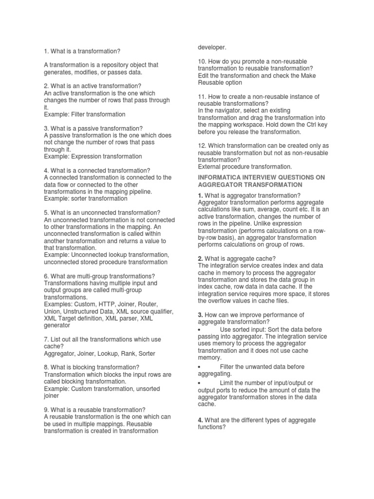 An active transformation is the one which changes the number of rows that pass through it. Example: Filter transformation 3. What is a passive transformation? A passive transformation is the one which does not change the number of rows that pass through it. Example: Expression transformation 4. What is a connected transformation? A connected transformation is connected to the data flow or connected to the other transformations in the mapping pipeline. Example: sorter transformation 5. What is an unconnected transformation? An unconnected transformation is not connected to other transformations in the mapping. An unconnected transformation is called within another transformation and returns a value to that transformation. Example: Unconnected lookup transformation, unconnected stored procedure transformation 6. What are multi-group transformations? Transformations having multiple input and output groups are called multi-group transformations. Examples: Custom, HTTP, Joiner, Router, Union, Unstructured Data, XML source qualifier, XML Target definition, XML parser, XML generator 7. List out all the transformations which use cache? Aggregator, Joiner, Lookup, Rank, Sorter 8. What is blocking transformation? Transformation which blocks the input rows are called blocking transformation. Example: Custom transformation, unsorted joiner 9. What is a reusable transformation? A reusable transformation is the one which can be used in multiple mappings. Reusable transformation is created in transformation
