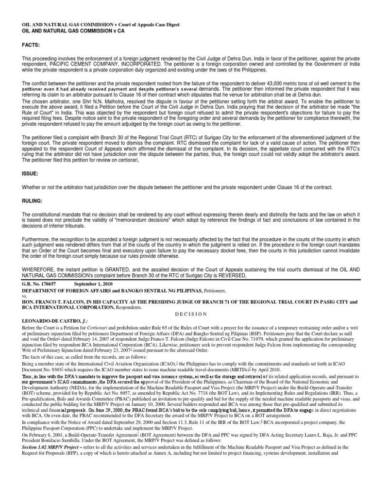 This proceeding involves the enforcement of a foreign judgment rendered by the Civil Judge of Dehra Dun, India in favor of the petitioner, against the private respondent, PACIFIC CEMENT COMPANY, INCORPORATED. The petitioner is a foreign corporation owned and controlled by the Government of India while the private respondent is a private corporation duly organized and existing under the laws of the Philippines. The conflict between the petitioner and the private respondent rooted from the failure of the respondent to deliver 43,000 metric tons of oil well cement to the petitioner even it had already received payment and despite petitioners several demands. The petitioner then informed the private respondent that it was referring its claim to an arbitrator pursuant to Clause 16 of their contract which stipulates that he venue for arbitration shall be at Dehra dun. The chosen arbitrator, one Shri N.N. Malhotra, resolved the dispute in favour of the petitioner setting forth the arbitral award. To enable the petitioner to execute the above award, it filed a Petition before the Court of the Civil Judge in Dehra Dun. India praying that the decision of the arbitrator be made "the Rule of Court" in India. This was objected by the respondent but foreign court refused to admit the private respondent's objections for failure to pay the required filing fees. Despite notice sent to the private respondent of the foregoing order and several demands by the petitioner for compliance therewith, the private respondent refused to pay the amount adjudged by the foreign court as owing to the petitioner. The petitioner filed a complaint with Branch 30 of the Regional Trial Court (RTC) of Surigao City for the enforcement of the aforementioned judgment of the foreign court. The private respondent moved to dismiss the complaint. RTC dismissed the complaint for lack of a valid cause of action. The petitioner then appealed to the respondent Court of Appeals which affirmed the dismissal of the complaint. In its decision, the appellate court concurred with the RTC's ruling that the arbitrator did not have jurisdiction over the dispute between the parties, thus, the foreign court could not validly adopt the arbitrator's award. The petitioner filed this petition for review on certiorari, ISSUE: Whether or not the arbitrator had jurisdiction over the dispute between the petitioner and the private respondent under Clause 16 of the contract. RULING: The constitutional mandate that no decision shall be rendered by any court without expressing therein dearly and distinctly the facts and the law on which it is based does not preclude the validity of "memorandum decisions" which adopt by reference the findings of fact and conclusions of law contained in the decisions of inferior tribunals. Furthermore, the recognition to be accorded a foreign judgment is not necessarily affected by the fact that the procedure in the courts of the country in which such judgment was rendered differs from that of the courts of the country in which the judgment is relied on. If the procedure in the foreign court mandates that an Order of the Court becomes final and executory upon failure to pay the necessary docket fees, then the courts in this jurisdiction cannot invalidate the order of the foreign court simply because our rules provide otherwise. WHEREFORE, the instant petition is GRANTED, and the assailed decision of the Court of Appeals sustaining the trial court's dismissal of the OIL AND NATURAL GAS COMMISSION's complaint before Branch 30 of the RTC of Surigao City is REVERSED, G.R. No. 176657 September 1, 2010 DEPARTMENT OF FOREIGN AFFAIRS and BANGKO SENTRAL NG PILIPINAS, Petitioners, vs. HON. FRANCO T. FALCON, IN HIS CAPACITY AS THE PRESIDING JUDGE OF BRANCH 71 OF THE REGIONAL TRIAL COURT IN PASIG CITY and BCA INTERNATIONAL CORPORATION, Respondents. DECISION LEONARDO-DE CASTRO, J.: Before the Court is a Petition for Certiorari and prohibition under Rule 65 of the Rules of Court with a prayer for the issuance of a temporary restraining order and/or a writ of preliminary injunction filed by petitioners Department of Foreign Affairs (DFA) and Bangko Sentral ng Pilipinas (BSP). Petitioners pray that the Court declare as null and void the Order1 dated February 14, 2007 of respondent Judge Franco T. Falcon (Judge Falcon) in Civil Case No. 71079, which granted the application for preliminary injunction filed by respondent BCA International Corporation (BCA). Likewise, petitioners seek to prevent respondent Judge Falcon from implementing the corresponding Writ of Preliminary Injunction dated February 23, 20072 issued pursuant to the aforesaid Order. The facts of this case, as culled from the records, are as follows: Being a member state of the International Civil Aviation Organization (ICAO),3 the Philippines has to comply with the commitments and standards set forth in ICAO Document No. 93034 which requires the ICAO member states to issue machine readable travel documents (MRTDs)5 by April 2010. Thus, in line with the DFAs mandate to improve the passport and visa issuance system, as well as the storage and retrieval o f its related application records, and pursuant to our governments ICAO commitments, the DFA secured the approval of the President of the Philippines, as Chairman of the Board of the National Economic and Development Authority (NEDA), for the implementation of the Machine Readable Passport and Visa Project (the MRP/V Project) under the Build-Operate-and-Transfer (BOT) scheme, provided for by Republic Act No. 6957, as amended by Republic Act No. 7718 (the BOT Law), and its Implementing Rules and Regulations (IRR). Thus, a Pre-qualification, Bids and Awards Committee (PBAC) published an invitation to pre-qualify and bid for the supply of the needed machine readable passports and visas, and conducted the public bidding for the MRP/V Project on January 10, 2000. Several bidders responded and BCA was among those that pre-qualified and su