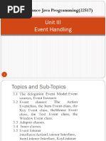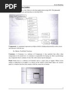 user like clicking over a button or pressing enter key in a text field etc. Listeners handle the events. Let us know the style (or design pattern) Java follows to handle the events. The event handling involves four types of classes. 1. Event Sources 2. Event classes 3. Event Listeners 4. Event Adapters 1. Event Sources Event sources are components, subclasses of java.awt.Component, capable to generate events. The event source can be a button, TextField or a Frame etc. 2. Event classes Almost every event source generates an event and is named by some Java class. For example, the event generated by button is known as ActionEvent and that ofCheckbox is known as ItemEvent. All the events are listed in java.awt.eventpackage. Following list gives a few components and their corresponding listeners.