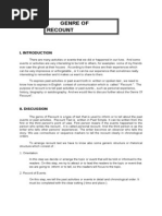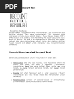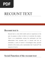 Its purpose is either to inform or to entertain the audience. There is no complication among the participants and that differentiates from narrative 2. Generic Structure of Recount 1. Orientation: Introducing the participants, place and time 2. Events: Describing series of event that happened in the past 3. Reorientation: It is optional. Stating personal comment of the writer to the story 3. Language Feature of Recount Introducing personal participant; I, my group, etc Using chronological connection; then, first, etc Using linking verb; was, were, saw, heard, etc Using action verb; look, go, change, etc Using simple past tense Small Notes Recount (Laporan peristiwa, kejadian atau kegiatan masa lampau) Ciri Umum (a) Tujuan Komunikatif Teks: Melaporkan peristiwa, kejadian atau kegiatan dengan tujuan memberitakan atau menghibur. (b) Struktur Teks/Generic structure Orientation; Pengenalan, yaitu memberikan informasi tentang siapa, di mana dan kapan; Events; Rekaman peristiwa, kejadian atau kegiatan yang terjadi, yang biasanya disampaikan dalam urutan kronologis; Komentar pribadi dan/atau ungkapan penilaian; Reorientation; Pengenalan ulang yang merangkum rentetan peristiwa, kejadian atau kegiatan. (c)Ciri Kebahasaan: Menggunakan: nouns dan pronouns sebagai kata ganti orang, hewan atau benda yang terlibat, misalnya David, the monkey, we dsb. action verbs atau kata kerja tindakan, misalnya go, sleep, run dsb. past tense, misalnya We went to the zoo; She was happy dsb. conjunctions dan time connectives yang mengurutkan peristiwa, kejadian atau kegiatan, misalnya and, but, then, after that, dsb.