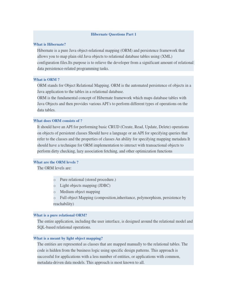 The ORM levels are: o Pure relational (stored procedure.) o Light objects mapping (JDBC) o Medium object mapping o Full object Mapping (composition,inheritance, polymorphism, persistence by reachability)