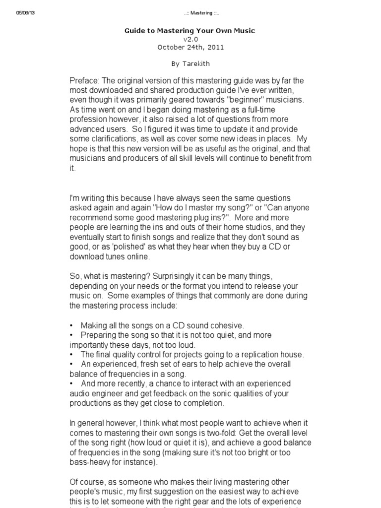 Guide to Mastering Your Own Music v2.0 October 24th, 2011 By Tarekith