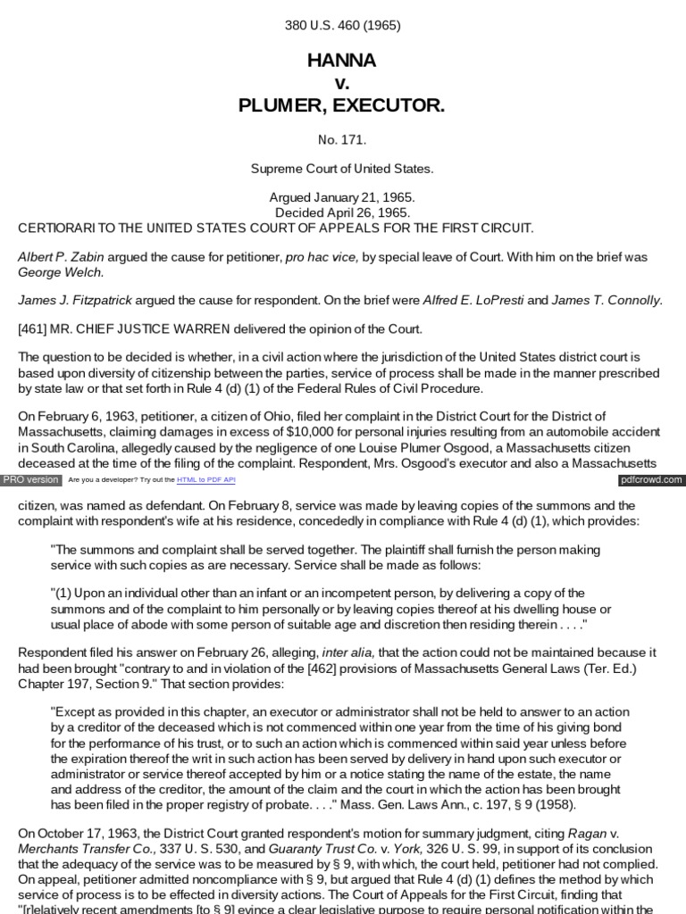 No. 171. Supreme Court of United States. Argued January 21, 1965. Decided April 26, 1965. CERTIORARI TO THE UNITED STATES COURT OF APPEALS FOR THE FIRST CIRCUIT. Albert P. Zabin argued the cause for petitioner, pro hac vice, by special leave of Court. With him on the brief was George Welch. James J. Fitzpatrick argued the cause for respondent. On the brief were Alfred E. LoPresti and James T. Connolly. [461] MR. CHIEF JUSTICE WARREN delivered the opinion of the Court. The question to be decided is whether, in a civil action where the jurisdiction of the United States district court is based upon diversity of citizenship between the parties, service of process shall be made in the manner prescribed by state law or that set forth in Rule 4 (d) (1) of the Federal Rules of Civil Procedure. On February 6, 1963, petitioner, a citizen of Ohio, filed her complaint in the District Court for the District of Massachusetts, claiming damages in excess of $10,000 for personal injuries resulting from an automobile accident in South Carolina, allegedly caused by the negligence of one Louise Plumer Osgood, a Massachusetts citizen deceased at the time of the filing of the complaint. Respondent, Mrs. Osgood's executor and also a Massachusetts