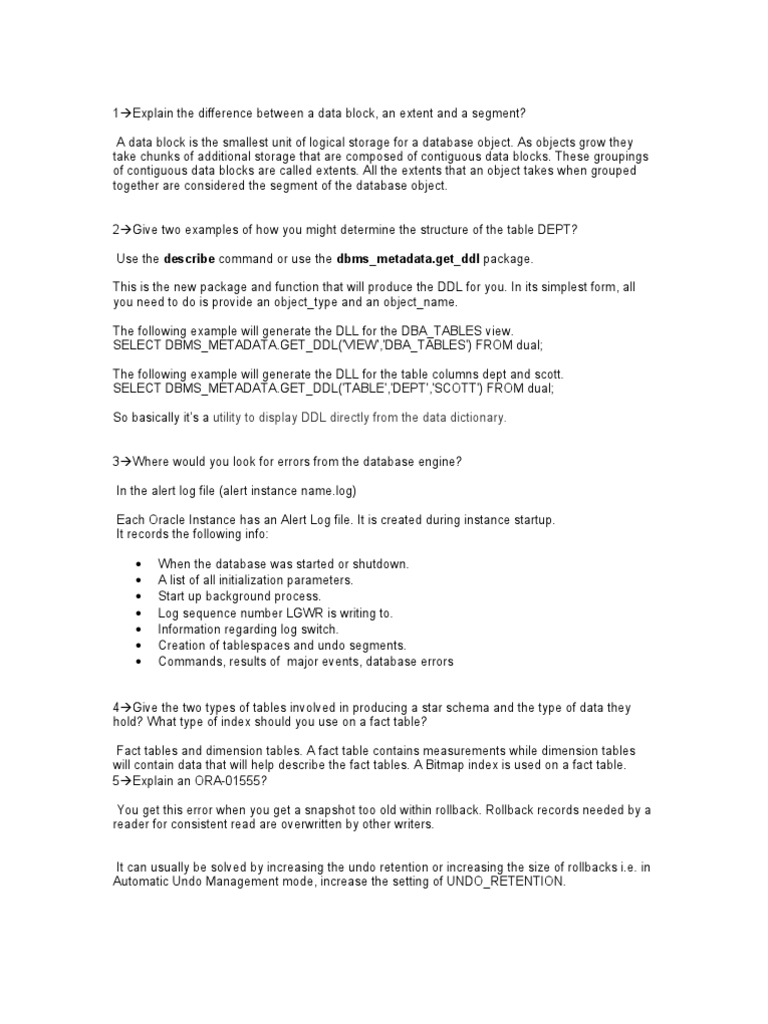 A data block is the smallest unit of logical storage for a database object. As objects grow they take chunks of additional storage that are composed of contiguous data blocks. These groupings of contiguous data blocks are called extents. All the extents that an object takes when grouped together are considered the segment of the database object. 2Give two examples of how you might determine the structure of the table DEPT? Use the describe command or use the dbms_metadata.get_ddl package. This is the new package and function that will produce the DDL for you. In its simplest form, all you need to do is provide an object_type and an object_name. The following example will generate the DLL for the DBA_TABLES view. SELECT DBMS_METADATA.GET_DDL('VIEW','DBA_TABLES') FROM dual; The following example will generate the DLL for the table columns dept and scott. SELECT DBMS_METADATA.GET_DDL('TABLE','DEPT','SCOTT') FROM dual; So basically its a utility to display DDL directly from the data dictionary. 3Where would you look for errors from the database engine? In the alert log file (alert instance name.log) Each Oracle Instance has an Alert Log file. It is created during instance startup. It records the following info: When the database was started or shutdown. A list of all initialization parameters. Start up background process. Log sequence number LGWR is writing to. Information regarding log switch. Creation of tablespaces and undo segments. Commands, results of major events, database errors