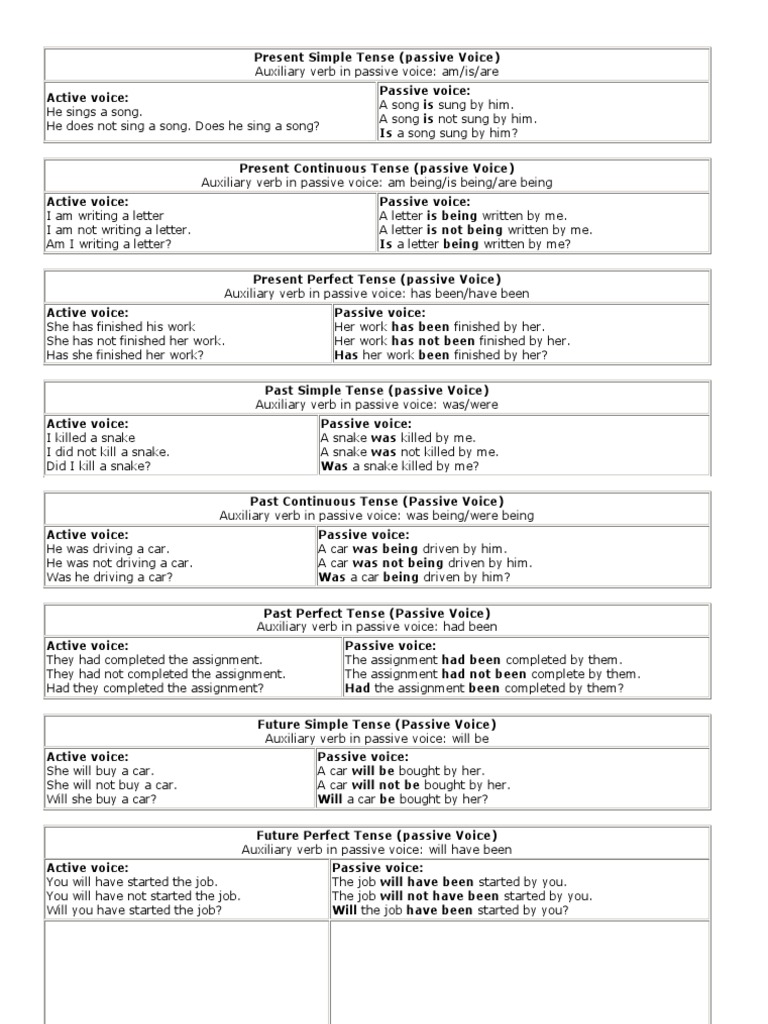 Present Continuous Tense (passive Voice) Auxiliary verb in passive voice: am being/is being/are being Active voice: I am writing a letter I am not writing a letter. Am I writing a letter? Passive voice: A letter is being written by me. A letter is not being written by me. Is a letter being written by me? Present Perfect Tense (passive Voice) Auxiliary verb in passive voice: has been/have been Active voice: She has finished his work She has not finished her work. Has she finished her work? Passive voice: Her work has been finished by her. Her work has not been finished by her. Has her work been finished by her? Past Simple Tense (passive Voice) Auxiliary verb in passive voice: was/were Active voice: I killed a snake I did not kill a snake. Did I kill a snake? Passive voice: A snake was killed by me. A snake was not killed by me. Was a snake killed by me? Past Continuous Tense (Passive Voice) Auxiliary verb in passive voice: was being/were being Active voice: He was driving a car. He was not driving a car. Was he driving a car? Passive voice: A car was being driven by him. A car was not being driven by him. Was a car being driven by him? Past Perfect Tense (Passive Voice) Auxiliary verb in passive voice: had been Active voice: They had completed the assignment. They had not completed the assignment. Had they completed the assignment? Passive voice: The assignment had been completed by them. The assignment had not been complete by them. Had the assignment been completed by them?