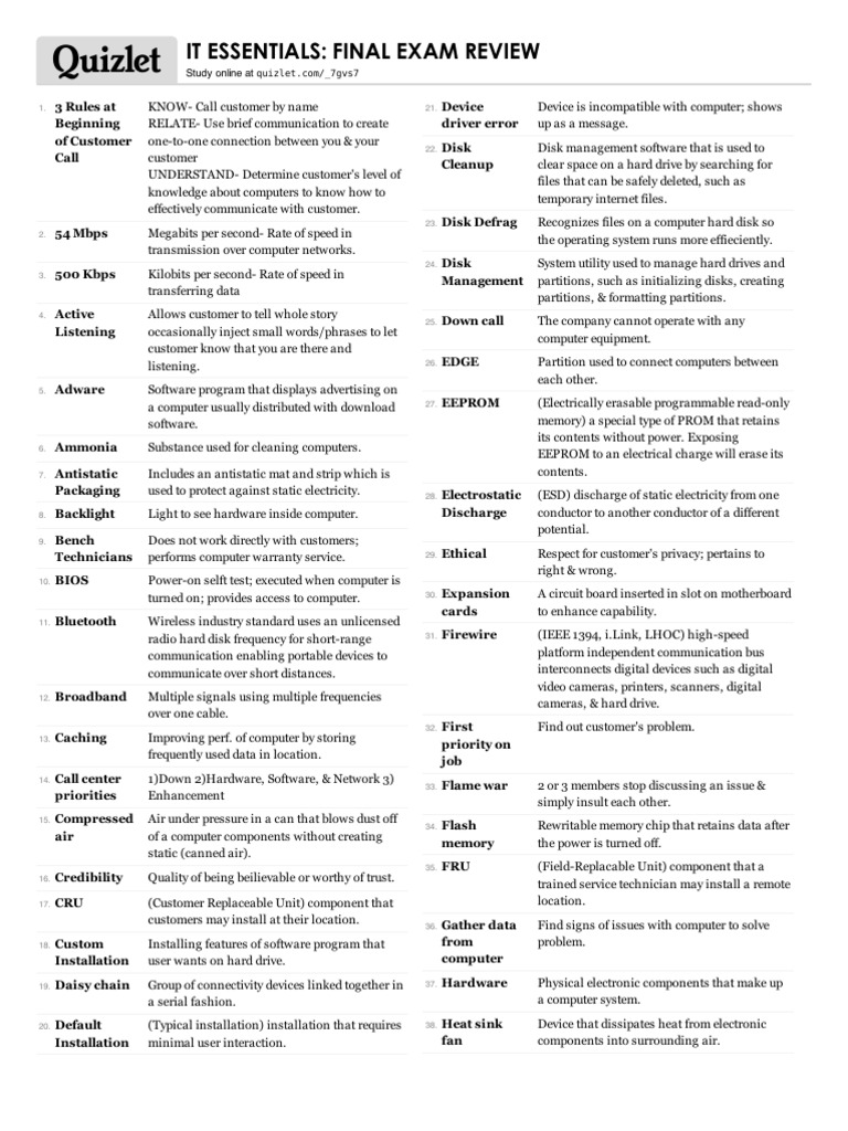 KNOW- Call customer by name RELATE- Use brief communication to create one-to-one connection between you & your customer UNDERSTAND- Determine customer's level of knowledge about computers to know how to effectively communicate with customer. Megabits per second- Rate of speed in transmission over computer networks. Kilobits per second- Rate of speed in transferring data Allows customer to tell whole story occasionally inject small words/phrases to let customer know that you are there and listening. Software program that displays advertising on a computer usually distributed with download software. Substance used for cleaning computers. Includes an antistatic mat and strip which is used to protect against static electricity. Light to see hardware inside computer. Does not work directly with customers; performs computer warranty service. Power-on selft test; executed when computer is turned on; provides access to computer. Wireless industry standard uses an unlicensed radio hard disk frequency for short-range communication enabling portable devices to communicate over short distances. Multiple signals using multiple frequencies over one cable. Improving perf. of computer by storing frequently used data in location. 1)Down 2)Hardware, Software, & Network 3) Enhancement Air under pressure in a can that blows dust off of a computer components without creating static (canned air). Quality of being beilievable or worthy of trust. (Customer Replaceable Unit) component that customers may install at their location. Installing features of software program that user wants on hard drive. Group of connectivity devices linked together in a serial fashion. (Typical installation) installation that requires minimal user interaction.