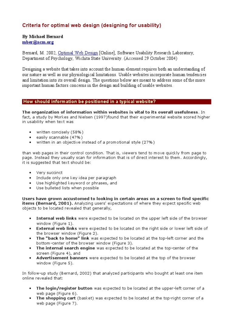 By Michael Bernard mber@acm.org Bernard, M. 2002, Optimal Web Design [Online], Software Usability Research Laboratory, Department of Psychology, Wichita State University. (Accessed 29 October 2004) Designing a website that takes into account the human element requires both an understanding of our nature as well as our physiological limitations. Usable websites incorporate human tendencies and limitation into its overall design. The questions below are meant to address some of the more important human factors concerns in the design and building of usable websites. How should information be positioned in a typical website?
