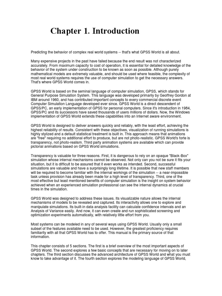 and the fifth section is for GPSS/PC users who want to take advantage of the Compatibility Mode of GPSS World. This last feature is available only in the Commercial Version of GPSS World. Installation and operating procedures are discussed in Chapter 2.