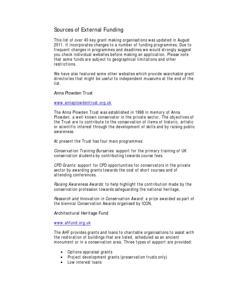 This list of over 40 key grant making organisations was updated in August 2011. It incorporates changes to a number of funding programmes. Due to frequent changes in programmes and deadlines we would strongly suggest you check individual websites before making an application. Please note that some funds are subject to geographical limitations and other restrictions. We have also featured some other websites which provide searchable grant directories that might be useful to independent museums at the end of the list. Anna Plowden Trust www.annaplowdentrust.org.uk The Anna Plowden Trust was established in 1998 in memory of Anna Plowden, a well known conservator in the private sector. The objectives of the Trust are to contribute to the conservation of items of historic, artistic or scientific interest through the development of skills and by raising public awareness. At present the Trust has four main programmes: Conservation Training Bursaries: support for the primary training of UK conservation students by contributing towards course fees. CPD Grants: support for CPD opportunities for conservators in the private sector by awarding grants towards the cost of short courses and of attending conferences. Raising Awareness Awards: to help highlight the contribution made by the conservation profession towards safeguarding the national heritage. Research and Innovation in Conservation Award: a prize awarded as part of the biennial Conservation Awards organised by ICON. Architectural Heritage Fund www.ahfund.org.uk The AHF provides grants and loans to charitable organisations to assist with the restoration of buildings that are listed, scheduled as an ancient monument or in a conservation area. Three types of support are provided: Options appraisal grants Project development grants (preservation trusts only) Low interest loans