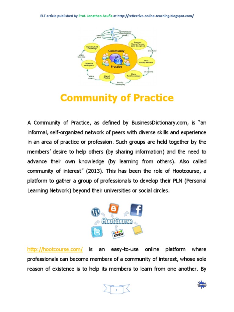 A Community of Practice, as defined by BusinessDictionary.com, is an informal, self-organized network of peers with diverse skills and experience in an area of practice or profession. Such groups are held together by the members desire to help others (by sharing information) and the need to advance their own knowledge (by learning from others). Also called community of interest (2013). This has been the role of Hootcourse, a platform to gather a group of professionals to develop their PLN (Personal Learning Network) beyond their universities or social circles.