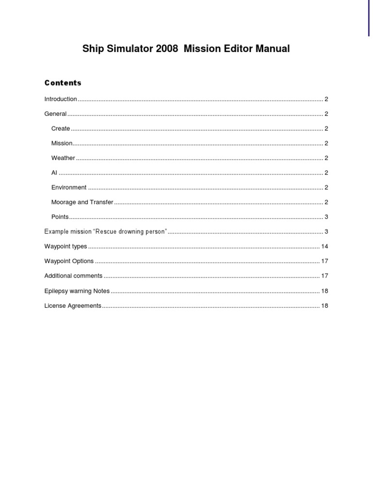 Introduction .............................................................................................................................................. 2 General .................................................................................................................................................... 2 Create .................................................................................................................................................. 2 Mission................................................................................................................................................. 2 Weather ............................................................................................................................................... 2 AI ......................................................................................................................................................... 2 Environment ........................................................................................................................................ 2 Moorage and Transfer ......................................................................................................................... 2 Points ................................................................................................................................................... 3 Example mission Rescue drowning person .......................................................................................... 3 Waypoint types ...................................................................................................................................... 14 Waypoint Options .................................................................................................................................. 17 Additional comments ............................................................................................................................. 17 Epilepsy warning Notes ......................................................................................................................... 18 License Agreements .............................................................................................................................. 18