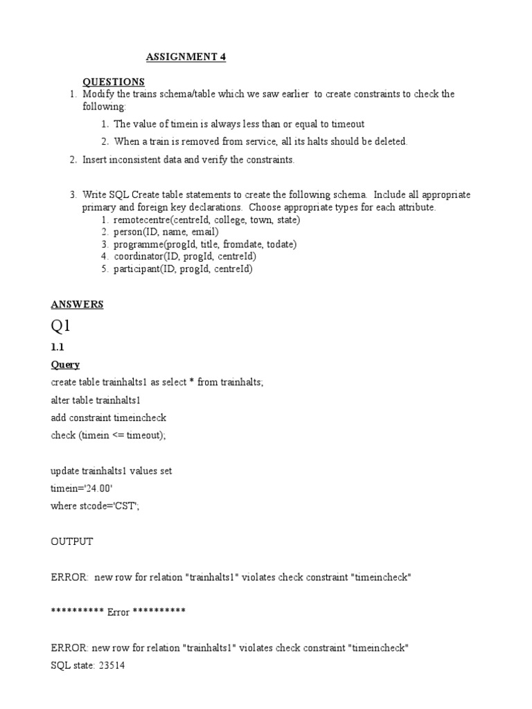 1.1 Query create table trainhalts1 as select * from trainhalts; alter table trainhalts1 add constraint timeincheck check (timein <= timeout); update trainhalts1 values set timein='24.00' where stcode='CST'; OUTPUT ERROR: new row for relation "trainhalts1" violates check constraint "timeincheck" ********** Error ********** ERROR: new row for relation "trainhalts1" violates check constraint "timeincheck" SQL state: 23514