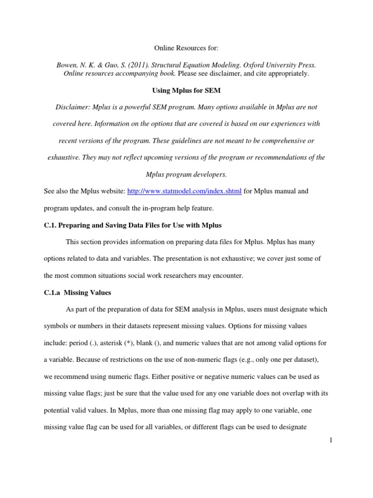 Online resources accompanying book. Please see disclaimer, and cite appropriately. Using Mplus for SEM Disclaimer: Mplus is a powerful SEM program. Many options available in Mplus are not covered here. Information on the options that are covered is based on our experiences with recent versions of the program. These guidelines are not meant to be comprehensive or exhaustive. They may not reflect upcoming versions of the program or recommendations of the Mplus program developers. See also the Mplus website: http://www.statmodel.com/index.shtml for Mplus manual and program updates, and consult the in-program help feature. C.1. Preparing and Saving Data Files for Use with Mplus This section provides information on preparing data files for Mplus. Mplus has many options related to data and variables. The presentation is not exhaustive; we cover just some of the most common situations social work researchers may encounter. C.1.a Missing Values As part of the preparation of data for SEM analysis in Mplus, users must designate which symbols or numbers in their datasets represent missing values. Options for missing values include: period (.), asterisk (*), blank (), and numeric values that are not among valid options for a variable. Because of restrictions on the use of non-numeric flags (e.g., only one per dataset), we recommend using numeric flags. Either positive or negative numeric values can be used as missing value flags; just be sure that the value used for any one variable does not overlap with its potential valid values. In Mplus, more than one missing flag may apply to one variable, one missing value flag can be used for all variables, or different flags can be used to designate 1