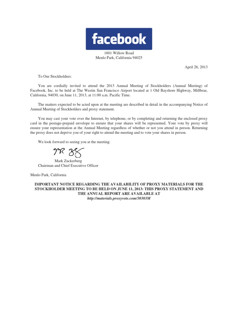 Mark Zuckerberg Chairman and Chief Executive Officer Menlo Park, California IMPORTANT NOTICE REGARDING THE AVAILABILITY OF PROXY MATERIALS FOR THE STOCKHOLDER MEETING TO BE HELD ON JUNE 11, 2013: THIS PROXY STATEMENT AND THE ANNUAL REPORT ARE AVAILABLE AT http://materials.proxyvote.com/30303M