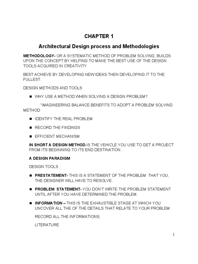 e. Enclosure-[structure, enclosing planes and openings] f. Systems-[mechanical, electrical, etc.] g. Economic-[first costs, maintenance cost] h. Human Factors-[Perception, behavior] Design Analysis- why do we think of so many great ideas? Because design involves problem solving and solving demands idea production. What then is the PROBLEM? Tentative solution- Brainstorming- a group process in which several people, for a given amount of time, gather together and discuss a particular problem. During this time, they all contribute positive thoughts to the discussion and try to produce a workable solution. Patience should be practiced. Dont be too anxious to come up with the perfect solution. Criticism- above all faith and confidence in yourself say what you feel. Question what you do not understand. PROBLEM SOLUTION CRITICISMS Geometric- the detailed visual inter-relationships between all the parts of the building as the operational stage develops. The visual objectives should be kept in mind at all stages but, because of the inherent difficulties of design team working, there is an increasing need to consider detailed engineering decisions in geometric terms.