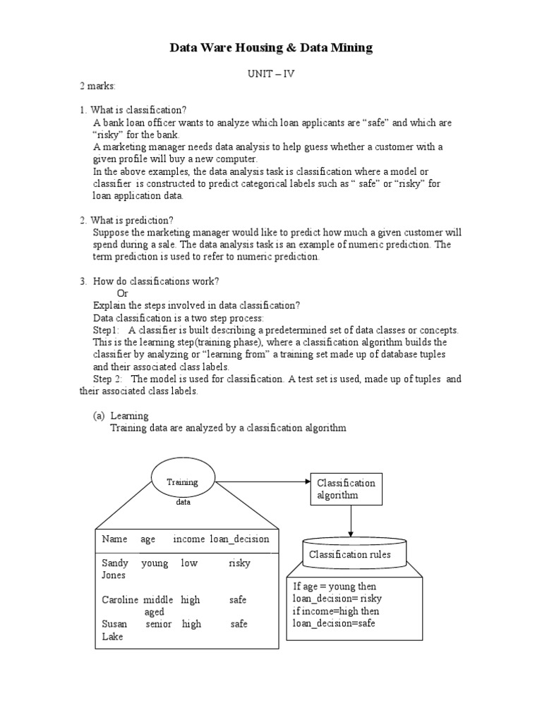 UNIT IV 2 marks: 1. What is classification? A bank loan officer wants to analyze which loan applicants are safe and which are risky for the bank. A marketing manager needs data analysis to help guess whether a customer with a given profile will buy a new computer. In the above examples, the data analysis task is classification where a model or classifier is constructed to predict categorical labels such as safe or risky for loan application data. 2. What is prediction? Suppose the marketing manager would like to predict how much a given customer will spend during a sale. The data analysis task is an example of numeric prediction. The term prediction is used to refer to numeric prediction. 3. How do classifications work? Or Explain the steps involved in data classification? Data classification is a two step process: Step1: A classifier is built describing a predetermined set of data classes or concepts. This is the learning step(training phase), where a classification algorithm builds the classifier by analyzing or learning from a training set made up of database tuples and their associated class labels. Step 2: The model is used for classification. A test set is used, made up of tuples and their associated class labels. (a) Learning Training data are analyzed by a classification algorithm