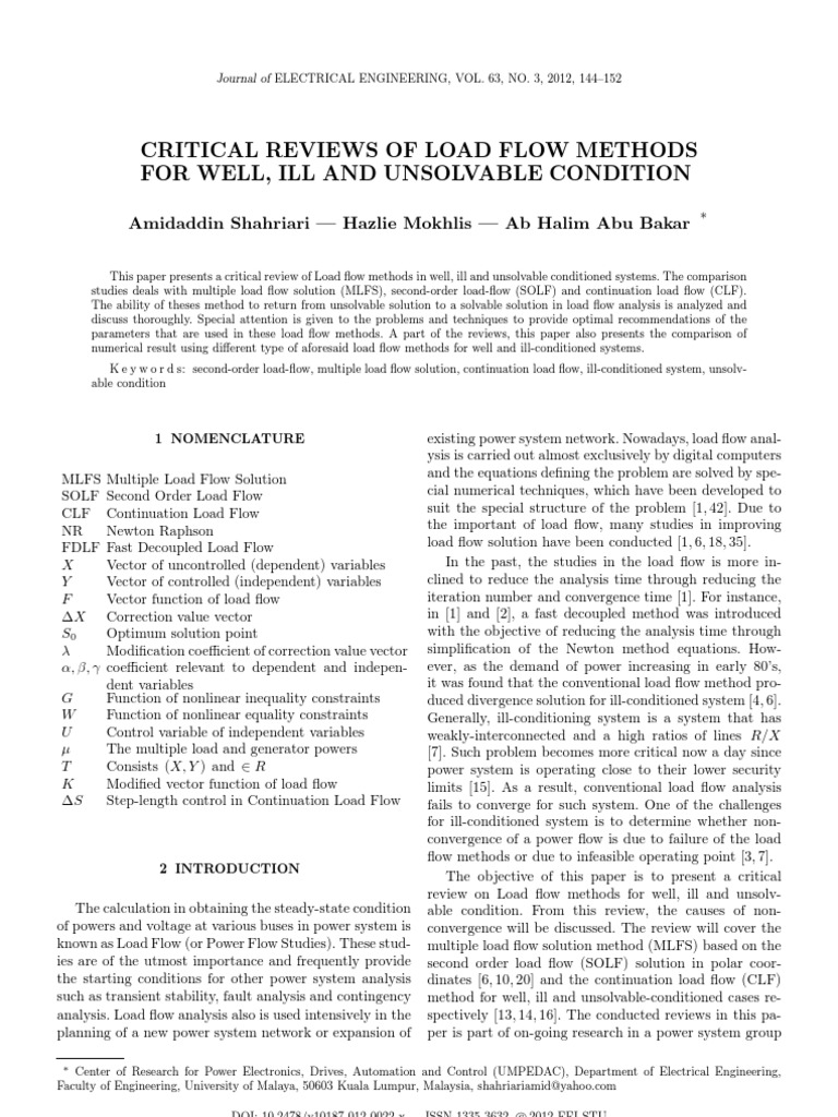 existing power system network. Nowadays, load ow analysis is carried out almost exclusively by digital computers and the equations dening the problem are solved by special numerical techniques, which have been developed to suit the special structure of the problem [1, 42]. Due to the important of load ow, many studies in improving load ow solution have been conducted [1, 6, 18, 35]. In the past, the studies in the load ow is more inclined to reduce the analysis time through reducing the iteration number and convergence time [1]. For instance, in [1] and [2], a fast decoupled method was introduced with the objective of reducing the analysis time through simplication of the Newton method equations. However, as the demand of power increasing in early 80s, it was found that the conventional load ow method produced divergence solution for ill-conditioned system [4, 6]. Generally, ill-conditioning system is a system that has weakly-interconnected and a high ratios of lines R/X [7]. Such problem becomes more critical now a day since power system is operating close to their lower security limits [15]. As a result, conventional load ow analysis fails to converge for such system. One of the challenges for ill-conditioned system is to determine whether nonconvergence of a power ow is due to failure of the load ow methods or due to infeasible operating point [3, 7]. The objective of this paper is to present a critical review on Load ow methods for well, ill and unsolvable condition. From this review, the causes of nonconvergence will be discussed. The review will cover the multiple load ow solution method (MLFS) based on the second order load ow (SOLF) solution in polar coordinates [6, 10, 20] and the continuation load ow (CLF) method for well, ill and unsolvable-conditioned cases respectively [13, 14, 16]. The conducted reviews in this paper is part of on-going research in a power system group