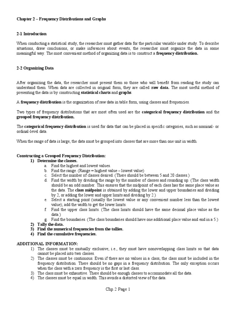 r data for the particular variable under study. To describe situations, draw conclusions, or make inferences about events, the researcher must organize the data in some meaningful way. The most convenient method of organizing data is to construct a frequency distribution. 2-2 Organizing Data After organizing the data, the researcher must present them so those who will benefit from reading the study can understand them. When data are collected in original form, they are called raw data. The most useful method of presenting the data is by constructing statistical charts and graphs. A frequency distribution is the organization of raw data in table form, using classes and frequencies. Two types of frequency distributions that are most often used are the categorical frequency distribution and the grouped frequency distribution. The categorical frequency distribution is used for data that can be placed in specific categories, such as nominal- or ordinal-level data. When the range of data is large, the data must be grouped into classes that are more than one unit in width. Constructing a Grouped Frequency Distribution: 1) Determine the classes. a. Find the highest and lowest values. b. Find the range. (Range = highest value lowest value) c. Select the number of classes desired. (There should be between 5 and 20 classes.) d. Find the width by dividing the range by the number of classes and rounding up. (The class width should be an odd number. This ensures that the midpoint of each class has the same place value as the data. The class midpoint is obtained by adding the lower and upper boundaries and dividing by 2, or adding the lower and upper limits and dividing by 2.) e. Select a starting point (usually the lowest value or any convenient number less than the lowest value); add the width to get the lower limits. f. Find the upper class limits. (The class limits should have the same decimal place value as the data.) g. Find the boundaries. (The class boundaries should have one additional place value and end in a 5.) 2) Tally the data. 3) Find the numerical frequencies from the tallies. 4) Find the cumulative frequencies. ADDITIONAL INFORMATION: 1) The classes must be mutually exclusive; i.e., they must have nonoverlapping class limits so that data cannot be placed into two classes. 2) The classes must be continuous. Even if there are no values in a class, the class must be included in the frequency distribution. There should be no gaps in a frequency distribution. The only exception occurs when the class with a zero frequency is the first or last class. 3) The class must be exhaustive. There should be enough classes to accommodate all the data. 4) The classes must be equal in width. This avoids a distorted view of the data.