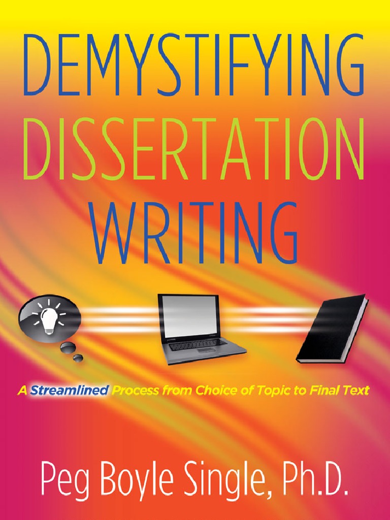 Demystifying Dissertation Writing provides clear and comprehensive direction for graduate students in any discipline. Dr. Singles practical, step-by-step guidelines not only helped me nish my dissertation in sociology, but her specic techniques transformed my approach to writing. Her system truly demysties the process and makes the dissertation writing experience manageable and even enjoyable. I highly recommend this bookit is packed with helpful tips and effective strategies designed to help doctoral students succeed.