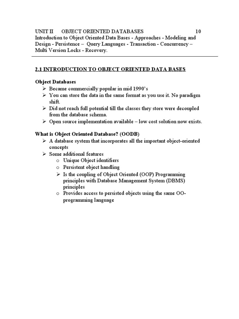 y Languages - Transaction - Concurrency Multi Version Locks - Recovery. 2.1 INTRODUCTION TO OBJECT ORIENTED DATA BASES Object Databases Became commercially popular in mid 1990s You can store the data in the same format as you use it. No paradigm shift. Did not reach full potential till the classes they store were decoupled from the database schema. Open source implementation available low cost solution now exists. What is Object Oriented Database? (OODB) A database system that incorporates all the important object-oriented concepts Some additional features o Unique Object identifiers o Persistent object handling Is the coupling of Object Oriented (OOP) Programming principles with Database Management System (DBMS) principles o Provides access to persisted objects using the same OOprogramming language