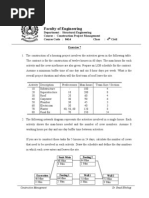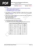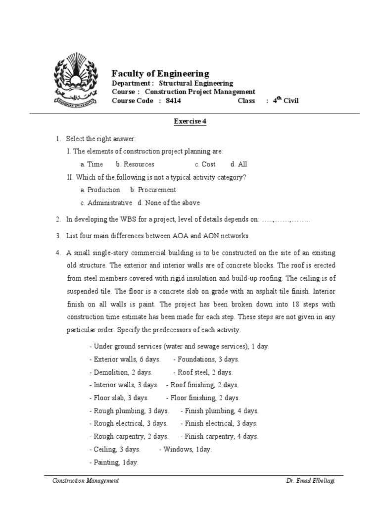 Department : Structural Engineering Course : Construction Project Management Course Code : 8414 Class Exercise 4 1. Select the right answer: I. The elements of construction project planning are: a. Time b. Resources b. Procurement c. Cost d. All II. Which of the following is not a typical activity category? a. Production c. Administrative d. None of the above 2. In developing the WBS for a project, level of details depends on: ..,,.. 3. List four main differences between AOA and AON networks. 4. A small single-story commercial building is to be constructed on the site of an existing old structure. The exterior and interior walls are of concrete blocks. The roof is erected from steel members covered with rigid insulation and build-up roofing. The ceiling is of suspended tile. The floor is a concrete slab on grade with an asphalt tile finish. Interior finish on all walls is paint. The project has been broken down into 18 steps with construction time estimate has been made for each step. These steps are not given in any particular order. Specify the predecessors of each activity. - Under ground services (water and sewage services), 1 day. - Exterior walls, 6 days. - Demolition, 2 days. - Floor slab, 3 days. - Foundations, 3 days. - Roof steel, 2 days. - Floor finishing, 2 days. - Finish plumbing, 4 days. - Finish electrical, 3 days. - Finish carpentry, 4 days. : 4th Civil