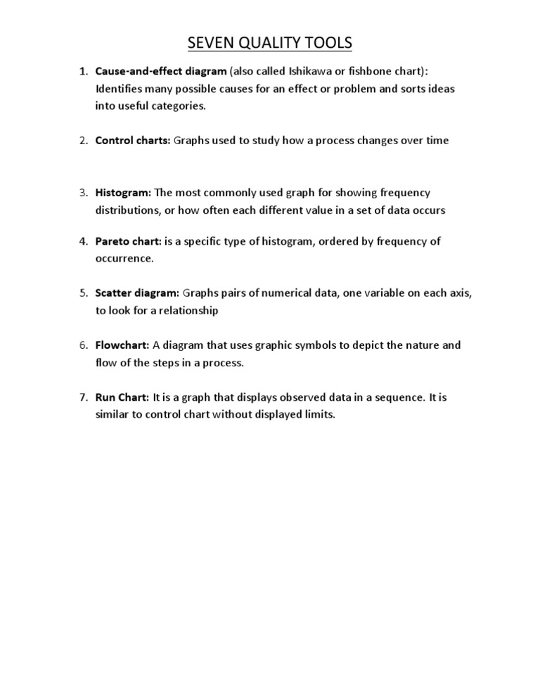 1. Cause-and-effect diagram (also called Ishikawa or fishbone chart): Identifies many possible causes for an effect or problem and sorts ideas into useful categories. 2. Control charts: Graphs used to study how a process changes over time