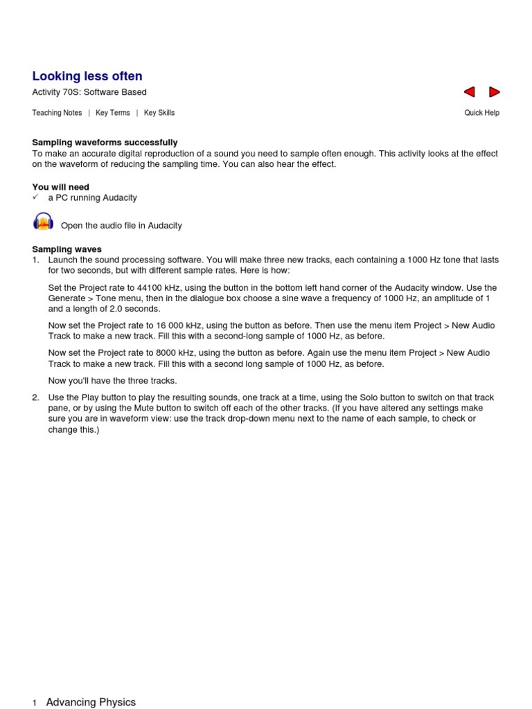 the number of samples per second at this new setting is unaltered. 6. Again play back each of the tracks independently. Discuss the effect of the sample rate on what you see and what you hear. You should notice much more difference between the sampling rates for this higher frequency. Try to account for this difference. 7. Explore your explanation by altering the frequencies of the samples, as in step 5 above. 8. You can easily generate your own tones and experiment with reducing the number of samples / second. Use File > New, and choose a high sample rate to start off with. Use the Generate menu and choose Tone. 9. You might like to record a sample at different sampling rates, if you have a microphone. Start a new file with File > New. Then set the project rate using the pop-up menu in the bottom left-hand corner. Rather low rates (say around 2000) make it easy to hear the effects. Then press the record button to make a new track. Sampling frequently enough 1. To get a faithful reproduction of a waveform you must sample often enough. 2. Reducing the sampling rate can affect the amplitude, quality and frequency of the sampled signal. 3. High-frequency components suffer most when the sampling rate is reduced.
