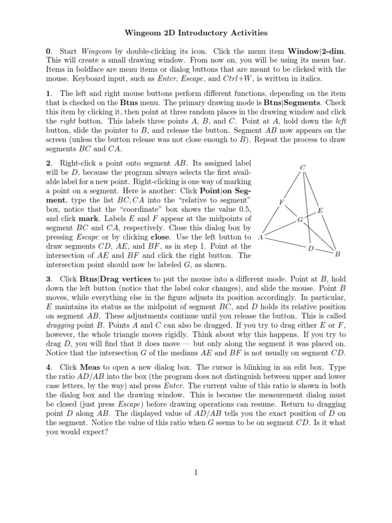 Wingeom 2D Introductory Activities 5. Not only does the program assign labels to new points, it also centers the labels directly over the points, and it puts measurements in the upper left corner of the drawing window. You can override these choices. First click Btns|Text to put the mouse into a new mode. Point at label A and press the right button. A new dialog box allows to change the label. Type P into the box and press Enter. You will see label A change to P . In the same way, change label B to Q. Notice that the displayed ratio AD/AB is now undened, so click Meas, select AD/AB in the list box, and click delete. Type P D/P Q, press Enter, and press Escape . Next point at any label in the gure, hold down the left button, slide the mouse a short distance, and release the button. The point does not move but the label does. Notice that the point is marked by a small circle, usually hidden by the label. Click Edit|Labels|Oset to move all the labels (this seldom places every label satisfactorily, however). Click Edit|Labels|Home to recenter all the labels. To choose a dierent font for the labels, click Edit|Labels|Font. 6. When the mouse is in Btns|Text mode, the right button is used to insert new text or edit old text anywhere on the screen, and the left button is used to drag (reposition) text. For example, drag the measurement to a spot that is closer to segment P Q. To send all calculations back to their default positions, click Other|Measurements|Home. 7. Click File|New to start anew. When asked to save your work, respond no. 8. Put the mouse into Btns|Segments mode, right-click four new points, then use the left button to create segments AB and CD. Put the mouse into Btns|Drag vertices mode, and drag some of the points so that the segments intersect. Here is a new way of labeling the intersection that is occasionally useful: Click Point|Intersection|Line-line, type AB into one edit box, CD into the other, and press Enter. Label E should appear. Press Escape to close the box. 9. Make sure that Other|Autoextend does not have a check mark. (If necessary, click it to remove the check.) Drag B somewhere so that segments AB and CD no longer intersect, and watch E disappear. Now activate the Other|Autoextend feature by clicking it. Notice that the segments are now extended as much as necessary to show their intersection, regardless of where the points are dragged.