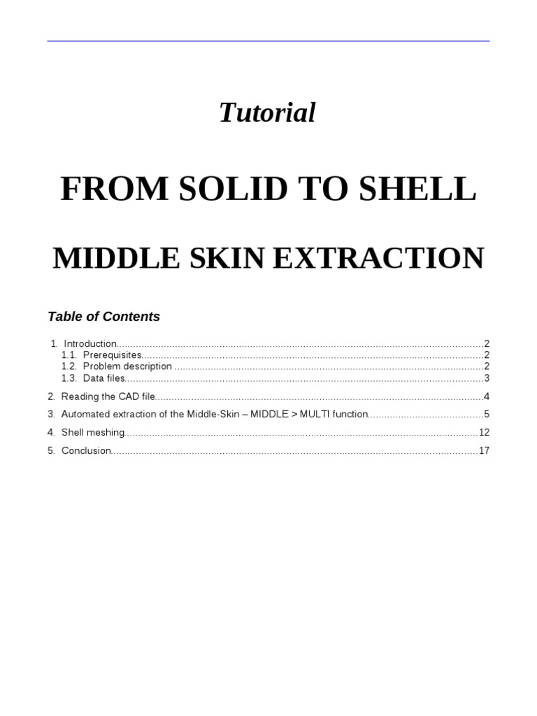 1. Introduction...................................................................................................................................2 1.1. Prerequisites..........................................................................................................................2 1.2. Problem description ...............................................................................................................2 1.3. Data files................................................................................................................................3 2. Reading the CAD file......................................................................................................................4 3. Automated extraction of the Middle-Skin MIDDLE > MULTI function.........................................5 4. Shell meshing...............................................................................................................................12 5. Conclusion...................................................................................................................................17