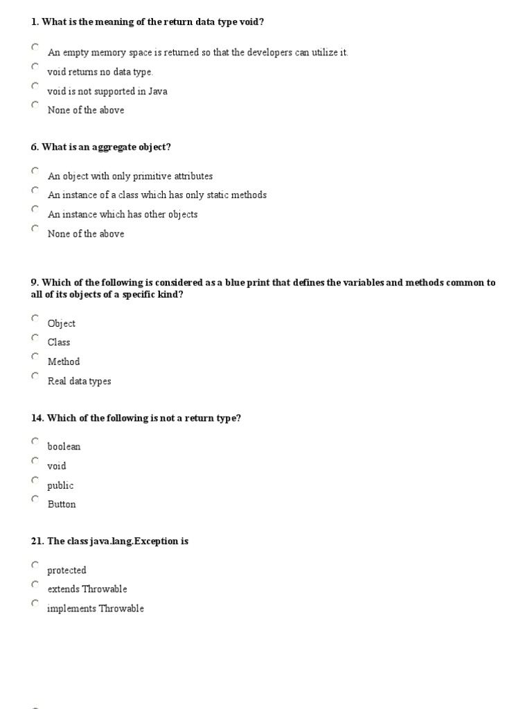 An empty memory space is returned so that the developers can utilize it. void returns no data type. void is not supported in Java None of the above 6. What is an aggregate object? An object with only primitive attributes An instance of a class which has only static methods An instance which has other objects None of the above