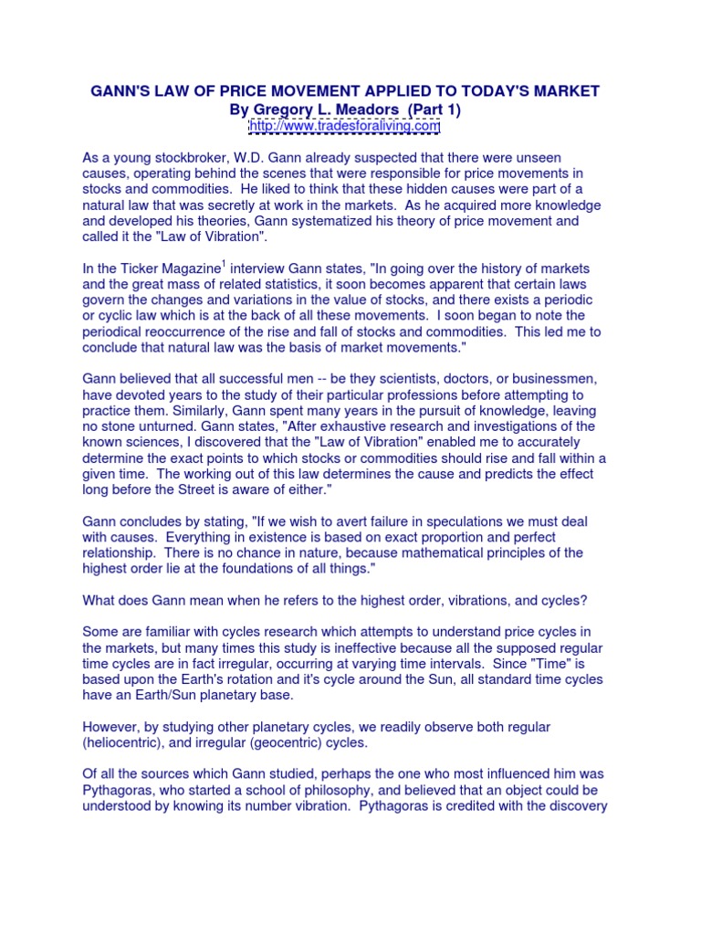 http://www.tradesforaliving.com As a young stockbroker, W.D. Gann already suspected that there were unseen causes, operating behind the scenes that were responsible for price movements in stocks and commodities. He liked to think that these hidden causes were part of a natural law that was secretly at work in the markets. As he acquired more knowledge and developed his theories, Gann systematized his theory of price movement and called it the "Law of Vibration". In the Ticker Magazine1 interview Gann states, "In going over the history of markets and the great mass of related statistics, it soon becomes apparent that certain laws govern the changes and variations in the value of stocks, and there exists a periodic or cyclic law which is at the back of all these movements. I soon began to note the periodical reoccurrence of the rise and fall of stocks and commodities. This led me to conclude that natural law was the basis of market movements." Gann believed that all successful men -- be they scientists, doctors, or businessmen, have devoted years to the study of their particular professions before attempting to practice them. Similarly, Gann spent many years in the pursuit of knowledge, leaving no stone unturned. Gann states, "After exhaustive research and investigations of the known sciences, I discovered that the "Law of Vibration" enabled me to accurately determine the exact points to which stocks or commodities should rise and fall within a given time. The working out of this law determines the cause and predicts the effect long before the Street is aware of either." Gann concludes by stating, "If we wish to avert failure in speculations we must deal with causes. Everything in existence is based on exact proportion and perfect relationship. There is no chance in nature, because mathematical principles of the highest order lie at the foundations of all things." What does Gann mean when he refers to the highest order, vibrations, and cycles? Some are familiar with cycles research which attempts to understand price cycles in the markets, but many times this study is ineffective because all the supposed regular time cycles are in fact irregular, occurring at varying time intervals. Since "Time" is based upon the Earth's rotation and it's cycle around the Sun, all standard time cycles have an Earth/Sun planetary base. However, by studying other planetary cycles, we readily observe both regular (heliocentric), and irregular (geocentric) cycles. Of all the sources which Gann studied, perhaps the one who most influenced him was Pythagoras, who started a school of philosophy, and believed that an object could be understood by knowing its number vibration. Pythagoras is credited with the discovery