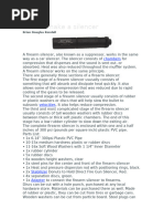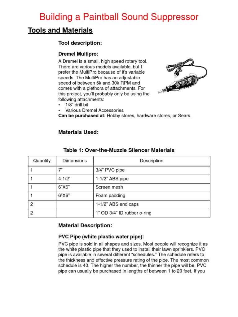 Step 1. Select the core Select a piece of PVC pipe to use as the inner core. For a snug fitting over-the-muzzle silencer, select a pipe with an outside diameter which is at least 1/8 larger than the outside diameter of your barrel. This will ensure that the wall of the core is thick enough at the muzzle-tosilencer junction to prevent accidental breakage. On a gun such as a PMI-1, the outside diameter of the barrel is 13/16 at the muzzle. I would therefore select a 3/4 schedule 40 PVC pipe (which actually has a 1 outside diameter.) And since the inside diameter of the 3/4 PVC is about 13/16, its ideal for Sheridan guns. Step 2. Fit the core to the barrel Since the inside diameter of the PVC pipe may not match the outside diameter of your barrel, you will have to modify the inside diameter of the PVC pipe so that it will fit snugly over the muzzle of your particular barrel. The best way to do this is usually by sanding the excess plastic away until the first inch of the pipe fits tightly onto the barrel. If you have a barrel with an outside diameter of 7/8 or 1 you may have to use the Dremel or similar tool to grind away the excess plastic. For slight changes, you can also try heating the PVC to its melting point and stretching it to fit the barrel. This, however, rarely produces good results and often creates a crooked silencer.