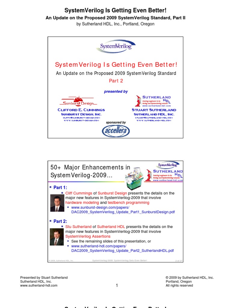Cliff Cummings of Sunburst Design presents the details on the major new features in SystemVerilog-2009 that involve hardware modeling and testbench programming www.sunburst-design.com/papers/ DAC2009_SystemVerilog_Update_Part1_SunburstDesign.pdf