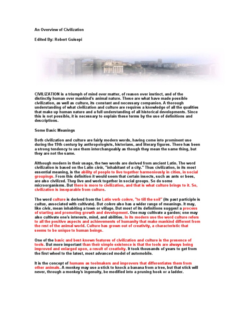 CIVILIZATION is a triumph of mind over matter, of reason over instinct, and of the distinctly human over mankind's animal nature. These are what have made possible civilization, as well as culture, its constant and necessary companion. A thorough understanding of what civilization and culture are requires a knowledge of all the qualities that make up human nature and a full understanding of all historical developments. Since this is not possible, it is necessary to explain these terms by the use of definitions and descriptions. Some Basic Meanings Both civilization and culture are fairly modern words, having come into prominent use during the 19th century by anthropologists, historians, and literary figures. There has been a strong tendency to use them interchangeably as though they mean the same thing, but they are not the same. Although modern in their usage, the two words are derived from ancient Latin. The word civilization is based on the Latin civis, "inhabitant of a city." Thus civilization, in its most essential meaning, is the ability of people to live together harmoniously in cities, in social groupings. From this definition it would seem that certain insects, such as ants or bees, are also civilized. They live and work together in social groups. So do some microorganisms. But there is more to civilization, and that is what culture brings to it. So, civilization is inseparable from culture. The word culture is derived from the Latin verb colere, "to till the soil" (its past participle is cultus, associated with cultivate). But colere also has a wider range of meanings. It may, like civis, mean inhabiting a town or village. But most of its definitions suggest a process of starting and promoting growth and development. One may cultivate a garden; one may also cultivate one's interests, mind, and abilities. In its modern use the word culture refers to all the positive aspects and achievements of humanity that make mankind different from the rest of the animal world. Culture has grown out of creativity, a characteristic that seems to be unique to human beings. One of the basic and best-known features of civilization and culture is the presence of tools. But more important than their simple existence is that the tools are always being improved and enlarged upon, a result of creativity. It took thousands of years to get from the first wheel to the latest, most advanced model of automobile. It is the concept of humans as toolmakers and improvers that differentiates them from other animals. A monkey may use a stick to knock a banana from a tree, but that stick will never, through a monkey's ingenuity, be modified into a pruning hook or a ladder.