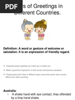 There are many different greeting customs around the world. Here are some. China Bow head slightly when introduced, as a sign of respect. Do not attempt body contact. Chinese who are used to interacting with Westerners will shake hands. A lack of eye contact should not be interpreted as a lack of assertiveness. Do not attempt to become too friendly too soon. Do not insist that they call you by your first name. The American pattern of quick informality should be resisted. Chinese point at objects with an open hand instead of the index finger. Beckoning to someone is done with a palm facing down. Avoid beckoning with your index finger facing up (this is the way to call a dog). If a Chinese business associate gives you a compliment, it is polite to deny it graciously. Modesty is highly valued in China Arab and Islamic Countries Always use your right hand for any contact; the left hand is reserved for personal hygiene. If you are left handed, explain why you are using your left hand. Arabs usually stand very close when talking; do not back away. In social situations, if you are kissed on both cheeks while shaking hands, return the greeting. Korea Men bow slightly and shake hands to greet each other. Women do not usually shake hands. To address someone with his or her full name, the family name comes first, then the first name. Chile People usually shake hands when they meet for the first time. When two women first meet, they sometimes give one kiss the cheek.(They actually kiss the air) Women also greet both male and female friends with akiss. Chilean men give their friends warm abrazos (hugs) or sometimes kiss women on the cheek. United States