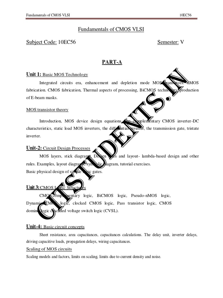 Introduction, MOS Device Design Equations, The Complementary CMOS Inverter DC Characterist ics, The Differential Inverter, Static Load MOS Inverters, The Transmissio n Gate Tristate Inverter 2 UNIT 2: CIRCUIT DESIGN PROCESSES MOS layers. Stick diagrams. Design rules and layout Lambda-based design and other rules. Examples. Layout diagrams. Symbo lic diagrams Tutorial exercises, Basic Physical Design of Simple logic gates