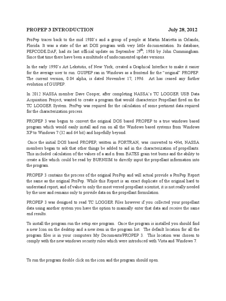 ProPep traces back to the mid 1980s and a group of people at Martin Marietta in Orlando, Florida. It was a state of the art DOS program with very little documentation. Its database, PEPCODE.DAF, had its last official update on September 29th, 1986 by John Cummingham. Since that time there have been a multitude of undocumented update versions. In the early 1990s Art Lekstutis, of New York, created a Graphical Interface to make it easier for the average user to run. GUIPEP ran in Windows as a frontend for the original PROPEP. The current version, 0.04 alpha, is dated November 17, 1996. Art has ceased any further evolution of GUIPEP. In 2012 NASSA member Dave Cooper, after completing NASSAs TC LOGGER USB Data Acquisition Project, wanted to create a program that would characterize Propellant fired on the TC LOGGER System. ProPep was required for the calculation of some pertinent data required for the characterization process. PROPEP 3 was begun to convert the original DOS based PROPEP to a true windows based program which would easily install and run on all the Windows based systems from Windows XP to Windows 7 (32 and 64 bit) and hopefully beyond. Once the initial DOS based PROPEP, written in FORTRAN, was converted to Net, NASSA members began to ask that other things be added to aid in the characterization of propellants. This included calculation of the values of a and n from BATES grain test burns and the ability to create a file which could be read by BURNSIM to directly input the propellant information into the program. PROPEP 3 contains the process of the original ProPep and will actual provide a ProPep Report the same as the original ProPep. While this Report is an exact duplicate of the original hard to understand report, and of value to only the most versed propellant scientist, it is not really needed by the user and remains only to provide data on the propellant formulation. PROPEP 3 was designed to read TC LOGGER Files however if you collected your propellant data using another system you have the option to manually enter that data and receive the same end results. To install the program run the setup.exe program. Once the program is installed you should find a new Icon on the desktop and a new item in the program list. The default location for all the program files is in your computers My Documents/PROPEP 3. This location was chosen to comply with the new windows security rules which were introduced with Vista and Windows 7.