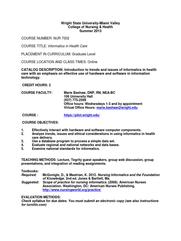 TITLE: Informatics in Health Care PLACEMENT IN CURRICULUM: Graduate Level COURSE LOCATION AND CLASS TIMES: Online CATALOG DESCRIPTION: Introduction to trends and issues of informatics in health care with an emphasis on effective use of hardware and software in information technology.