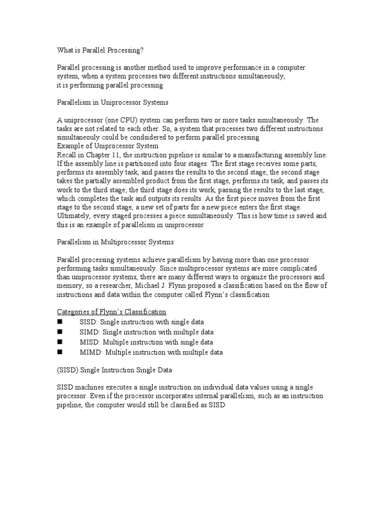 Parallel processing is another method used to improve performance in a computer system, when a system processes two different instructions simultaneously, it is performing parallel processing Parallelism in Uniprocessor Systems A uniprocessor (one CPU) system can perform two or more tasks simultaneously. The tasks are not related to each other. So, a system that processes two different instructions simultaneouly could be condsidered to perform parallel processing Example of Uniprocessor System Recall in Chapter 11, the instruction pipeline is similar to a manufacturing assembly line. If the assembly line is partitioned into four stages: The first stage receives some parts, performs its assembly task, and passes the results to the second stage; the second stage takes the partially assembled product from the first stage, performs its task, and passes its work to the third stage; the third stage does its work, passing the results to the last stage, which completes the task and outputs its results. As the first piece moves from the first stage to the second stage, a new set of parts for a new piece enters the first stage. Ultimately, every staged processes a piece simultaneously. This is how time is saved and this is an example of parallelism in uniprocessor Parallelism in Multiprocessor Systems Parallel processing systems achieve parallelism by having more than one processor performing tasks simultaneously. Since multiprocessor systems are more complicated than uniprocessor systems, there are many different ways to organize the processors and memory, so a researcher, Michael J. Flynn proposed a classification based on the flow of instructions and data within the computer called Flynns classification Categories of Flynns Classification SISD: Single instruction with single data SIMD: Single instruction with multiple data MISD: Multiple instruction with single data MIMD: Multiple instruction with multiple data (SISD) Single Instruction Single Data SISD machines executes a single instruction on individual data values using a single processor. Even if the processor incorporates internal parallelism, such as an instruction pipeline, the computer would still be classified as SISD