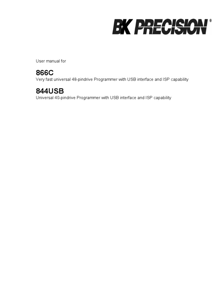This user manual covers some B+K PRECISION programmers: 866C and 844USB. 866C is a new and faster version of 866B programmer (without LPT port interface). 844USB is a small, fast and powerful USB interfaced programmer of all kinds of programmable devices. Using build-in ISP connector the programmer is able to program ISP capable chips in-circuit. It has design, which allows easily add new devices to the device list. Nice "value for money" in this class. All these programmers work with almost any IBM PC Pentium compatible or higher, portable or desktop personal computers. Programmers use the USB port All programmers function flawlessly on Windows operating system (see section PC requirement). All these programmers are driven by an easy-to-use, control program with pull-down menus, hot keys and online help. Control program is common for all these B+K PRECISION's programmers (859, 866B, 866C, 844USB and 848A). Advanced design, including protection circuits, original brand components and careful manufacturing allows us to provide a one-years warranty on parts and labor for these programmers (limited 25,000 cycle warranty on ZIF socket).