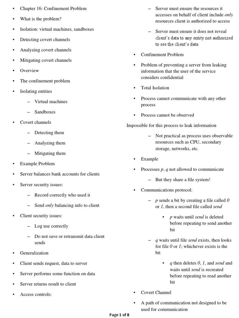 Isolation: virtual machines, sandboxes Detecting covert channels Analyzing covert channels Mitigating covert channels Overview The confinement problem Isolating entities Virtual machines Sandboxes
