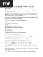 Step 3: Install statsconnDCOM 1. In Windows Explorer double-click on statconnDCOM.latest.exe (you may not see the exe extension) 2. Click Yes to allow to make changes 3. Accept License agreement 4. In Select Destination Location make sure to change the Program Files to R i.e. location should be C:\R\statconn\DCOM 5. Accept default installation in next dialogs, and in Ready to install Click Install 6. You should end up with a dialog Completing the statconnDCOM Setup Wizard, and Click Finish Step 4: Install RExcel 1. In Windows Explorer double-click on RExcelInst.latest.exe (you may not see the exe extension) 2. Click Yes to allow changes 3. Accept License agreement 4. In Select Destination Location make sure to change the Program Files to R i.e. location should be C:\R\RExcel 5. Accept default installation in next dialogs, and in Ready to install Click Install 6. You may now get a dialog about R version, Click OK 7. You will also get a dialog about Excel being hidden during install, Click OK 8. And you will get a dialog about multiple users of Excel, Click OK 9. And you will get a dialog about Help in RExcel, Click OK 10.You should end up with a dialog Completing the RExcel Setup Wizard, and Click Finish Step 5: Check RExcel working 1. Start Excel