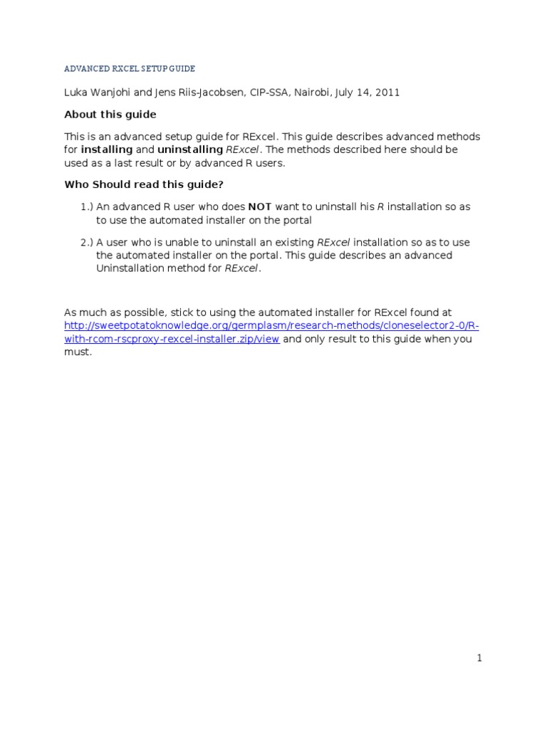 Luka Wanjohi and Jens Riis-Jacobsen, CIP-SSA, Nairobi, July 14, 2011 About this guide This is an advanced setup guide for RExcel. This guide describes advanced methods for installing and uninstalling RExcel. The methods described here should be used as a last result or by advanced R users. Who Should read this guide? 1.) An advanced R user who does NOT want to uninstall his R installation so as to use the automated installer on the portal 2.) A user who is unable to uninstall an existing RExcel installation so as to use the automated installer on the portal. This guide describes an advanced Uninstallation method for RExcel.