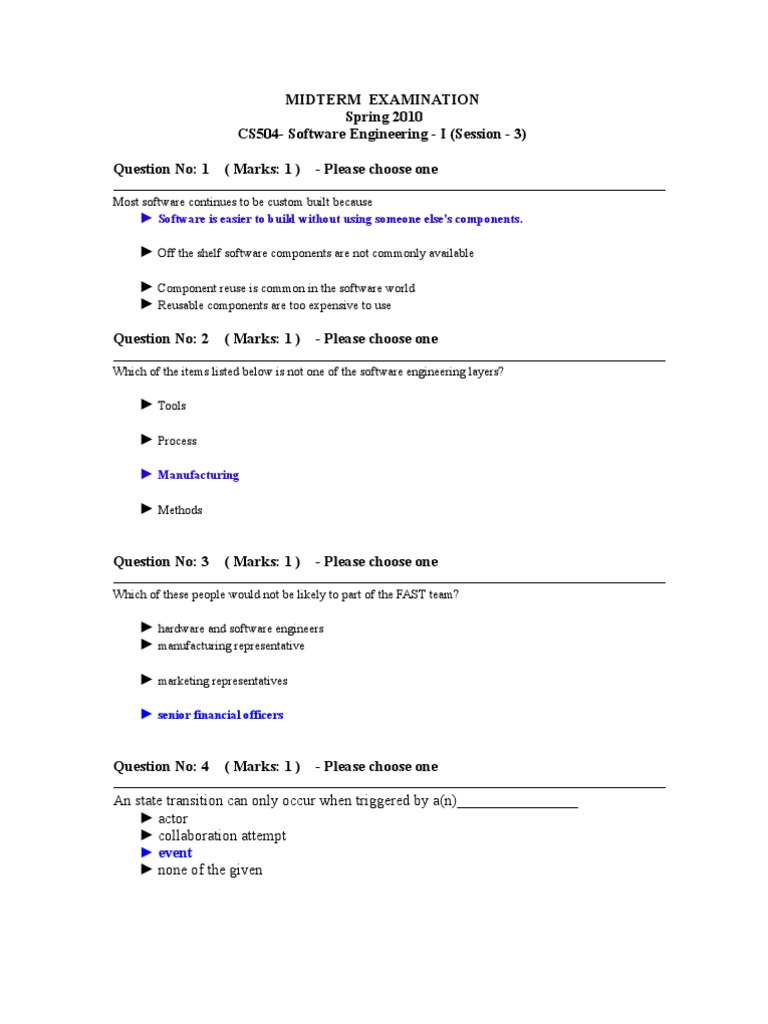 MIDTERM EXAMINATION Spring 2010 CS504- Software Engineering - I (Session - 3) Question No: 1 ( Marks: 1 ) - Please choose one