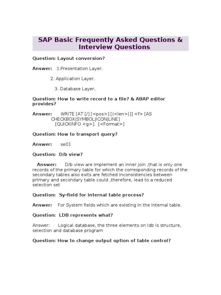 Question: Layout conversion? Answer: 1.Presentation Layer. 2. Application Layer. 3. Database Layer. Question: How to write record to a file? & ABAP editor provides? Answer: WRITE [AT [/] [<pos>] [(<len>)]] <f> [AS CHECKBOX|SYMBOL|ICON|LINE] [QUICKINFO <g>]. [<Format>] Question: How to transport query? Answer: se01