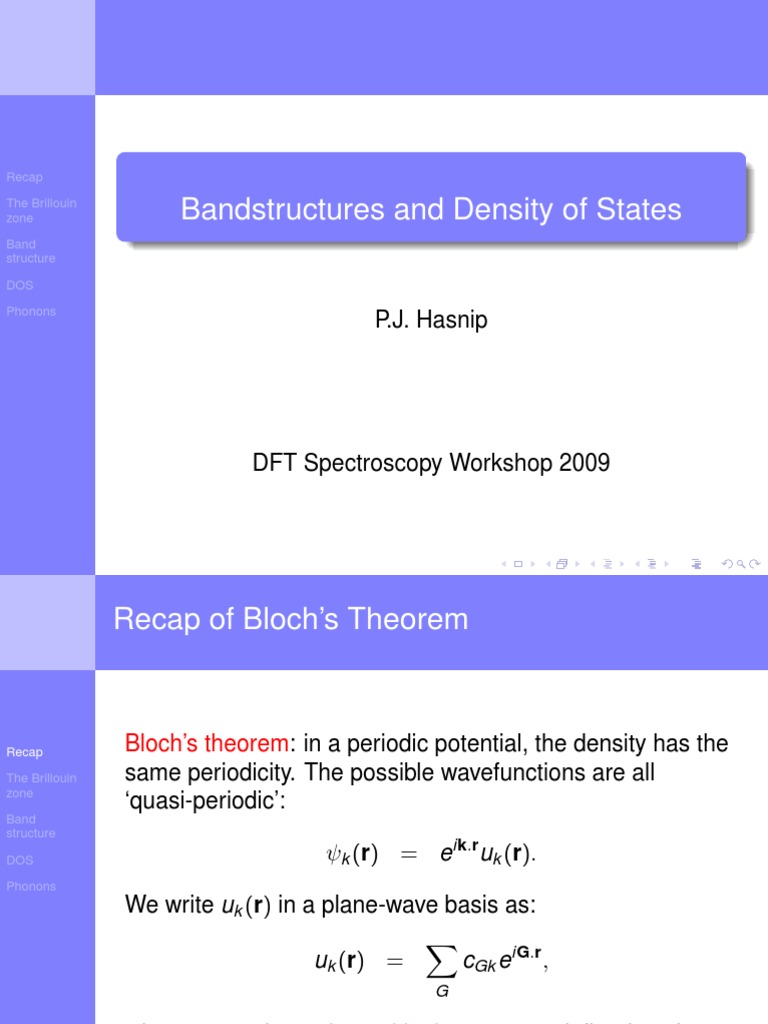 Blochs theorem: in a periodic potential, the density has the same periodicity. The possible wavefunctions are all quasi-periodic: k (r) = ei k.r uk (r). We write uk (r) in a plane-wave basis as: uk (r) =