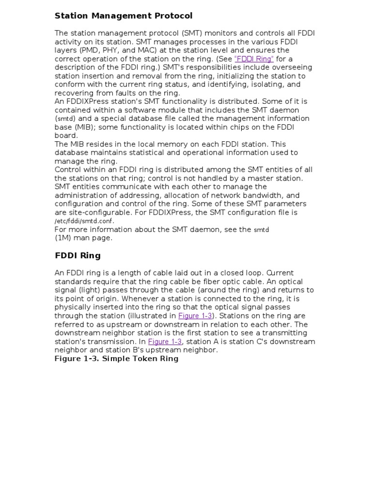 The station management protocol (SMT) monitors and controls all FDDI activity on its station. SMT manages processes in the various FDDI layers (PMD, PHY, and MAC) at the station level and ensures the correct operation of the station on the ring. (See FDDI Ring for a description of the FDDI ring.) SMT's responsibilities include overseeing station insertion and removal from the ring, initializing the station to conform with the current ring status, and identifying, isolating, and recovering from faults on the ring. An FDDIXPress station's SMT functionality is distributed. Some of it is contained within a software module that includes the SMT daemon (smtd) and a special database file called the management information base (MIB); some functionality is located within chips on the FDDI board. The MIB resides in the local memory on each FDDI station. This database maintains statistical and operational information used to manage the ring. Control within an FDDI ring is distributed among the SMT entities of all the stations on that ring; control is not handled by a master station. SMT entities communicate with each other to manage the administration of addressing, allocation of network bandwidth, and configuration and control of the ring. Some of these SMT parameters are site-configurable. For FDDIXPress, the SMT configuration file is /etc/fddi/smtd.conf. For more information about the SMT daemon, see the smtd (1M) man page.