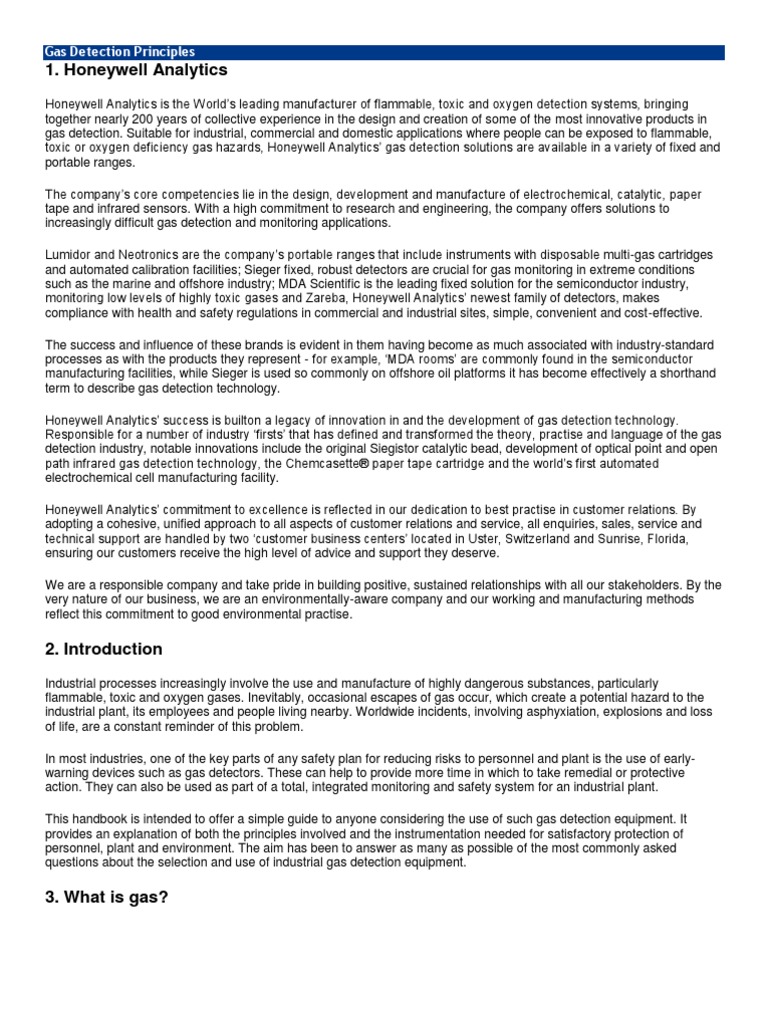 Honeywell Analytics is the Worlds leading manufacturer of flammable, toxic and oxygen detection systems, bringing together nearly 200 years of collective experience in the design and creation of some of the most innovative products in gas detection. Suitable for industrial, commercial and domestic applications where people can be exposed to flammable, toxic or oxygen deficiency gas hazards, Honeywell Analytics gas detection solutions are available in a vari ety of fixed and portable ranges. The companys core competencies lie in the design, development and manufacture of electrochemical, catalytic, paper tape and infrared sensors. With a high commitment to research and engineering, the company offers solutions to increasingly difficult gas detection and monitoring applications. Lumidor and Neotronics are the companys portable ranges that include instruments with disposable multi -gas cartridges and automated calibration facilities; Sieger fixed, robust detectors are crucial for gas monitoring in extreme conditions such as the marine and offshore industry; MDA Scientific is the leading fixed solution for the semiconductor industry, monitoring low levels of highly toxic gases and Zareba, Honeywell Analytics newe st family of detectors, makes compliance with health and safety regulations in commercial and industrial sites, simple, convenient and cost-effective. The success and influence of these brands is evident in them having become as much associated with industry-standard processes as with the products they represent - for example, MDA rooms are commonly found in the semiconductor manufacturing facilities, while Sieger is used so commonly on offshore oil platforms it has become effectively a shorthand term to describe gas detection technology. Honeywell Analytics success is builton a legacy of innovation in and the development of gas detection technology. Responsible for a number of industry firsts that has defined and transformed the theory, practise and la nguage of the gas detection industry, notable innovations include the original Siegistor catalytic bead, development of optical point and open path infrared gas detection technology, the Chemcasette paper tape cartridge and the worlds first automated electrochemical cell manufacturing facility. Honeywell Analytics commitment to excellence is reflected in our dedication to best practise in customer relations. By adopting a cohesive, unified approach to all aspects of customer relations and service, all enquiries, sales, service and technical support are handled by two customer business centers located in Uster, Switzerland and Sunrise, Florida, ensuring our customers receive the high level of advice and support they deserve. We are a responsible company and take pride in building positive, sustained relationships with all our stakeholders. By the very nature of our business, we are an environmentally-aware company and our working and manufacturing methods reflect this commitment to good environmental practise.